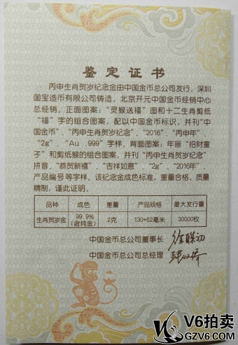 名稱: Lot176-61 2016年丙申生肖賀歲紀(jì)念金鈔2g 帶冊證