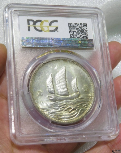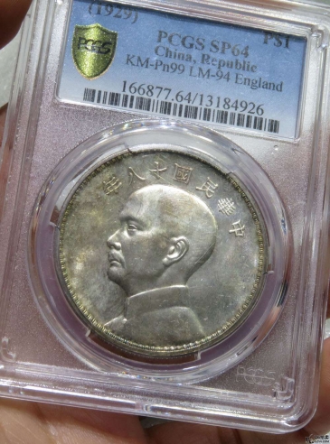 民國十八年英國版孫中山像背三帆船壹元銀幣樣幣一枚,幣面圖樣由英國皇家鑄幣廠 (British Royal mint)設計,由中華民國駐英國公使館列明模具要求,交由Langford Jones鑄模。正面為國父胸像,背面卻與常見的背帆孫像銀幣不同,海浪波濤更加洶涌。版底細膩無痕,品相完美,PCGS- SP64,目前為該公司評級紀錄第一名