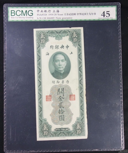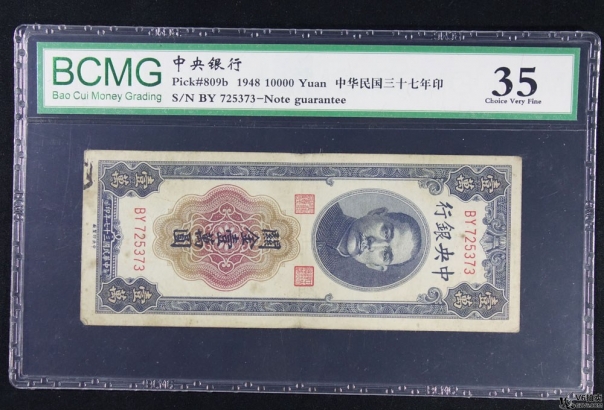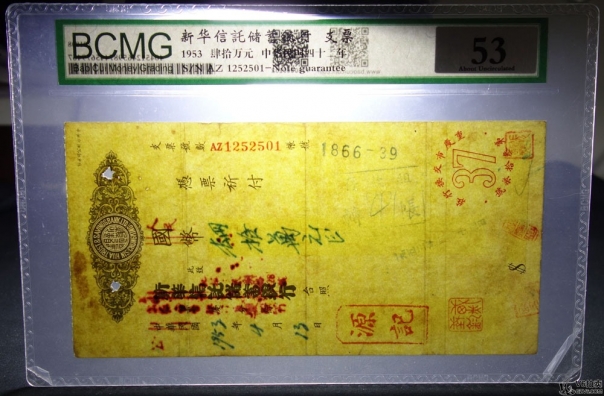 名稱: Lot82-107: BCMG-35-民國(guó)三十七年關(guān)金卷壹萬(wàn)圓 冠號(hào):BY725373 /BCMG-45-民國(guó)十九年關(guān)金劵貳拾圓 冠號(hào):CH806889 /BCMG-53-民國(guó)四十二年新華信托儲(chǔ)蓄銀行肆拾萬(wàn)元支票 冠號(hào):AZ1252501 共3張