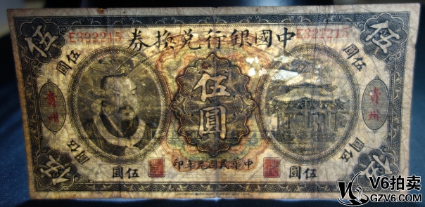 名稱: Lot95-134: 民國元年中國銀行兌換券伍圓 加蓋貴州 E322215 有穿孔 有脫皮 7品