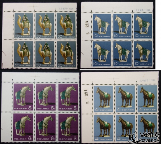 名稱: Lot95-171: 特46唐三彩 6方聯(lián)一套 帶角邊廠銘 微黃 邊齒微折 上品