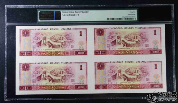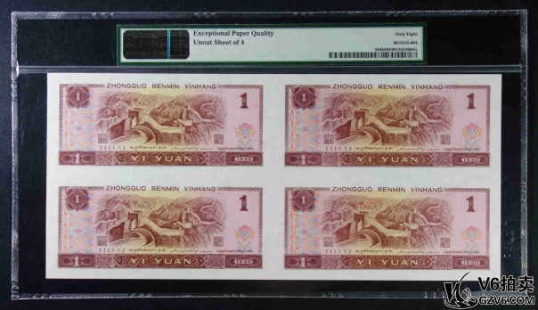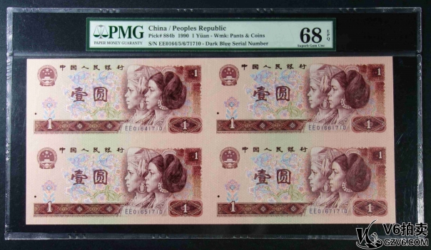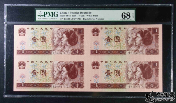 名稱: Lot95-238: PMG-66EPQ/66EPQ*2-四版人民幣壹圓四方連體鈔一套 EE0164/5/6/71710 帶冊(cè)證
