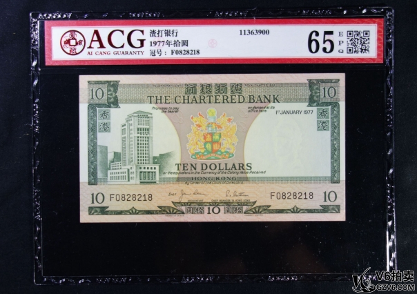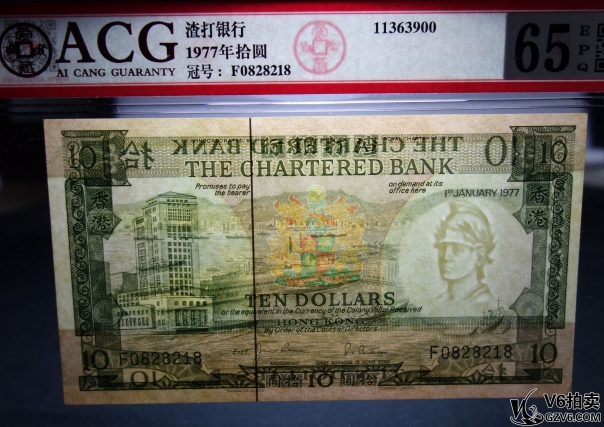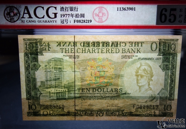 名稱: Lot82-4: ACG-65EPQ-1977年香港渣打銀行拾圓 2連號 冠號:F0828218-219 共2張