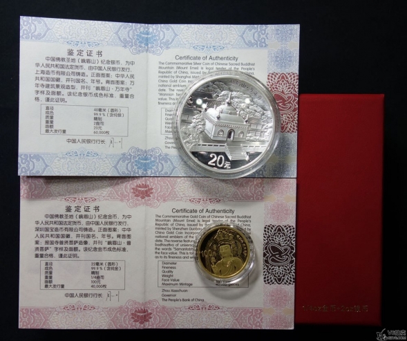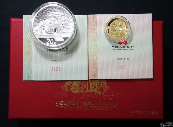 名稱: Lot82-102: 2014年峨眉山紀(jì)念金銀套幣(含1/4盎司金幣,2盎司銀幣)帶盒證