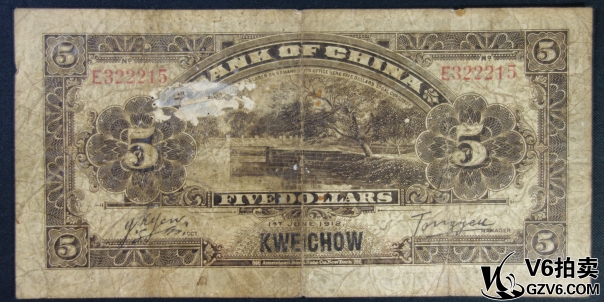 名稱: Lot95-134: 民國元年中國銀行兌換券伍圓 加蓋貴州 E322215 有穿孔 有脫皮 7品